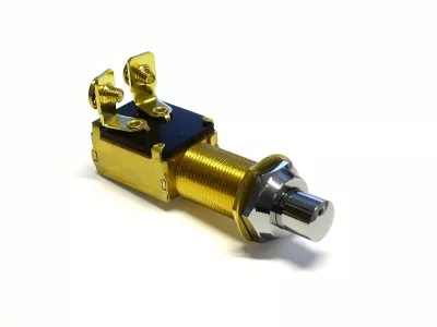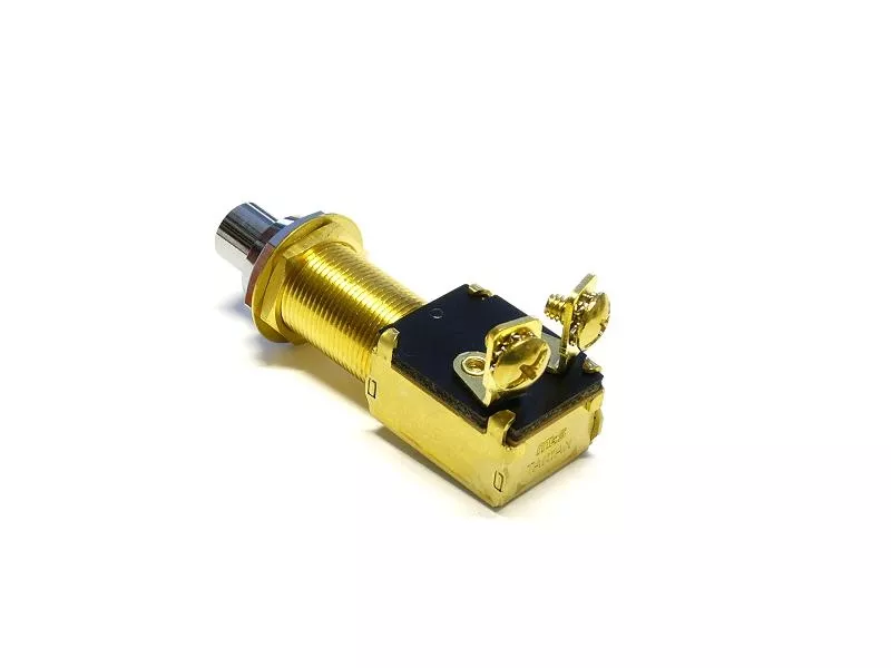 Drucktaster aus Messing, mit verchromtem Knopf.