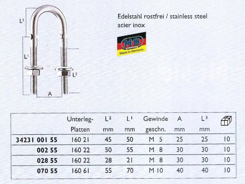 Sprenger U-Bolzen Edelstahl rostfrei - Gewinde M10 x 55 mm